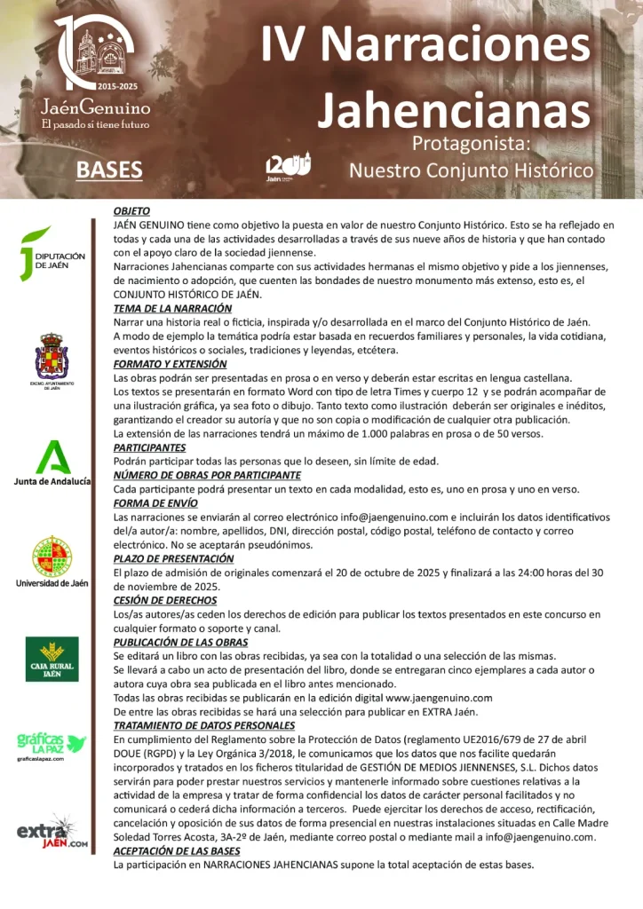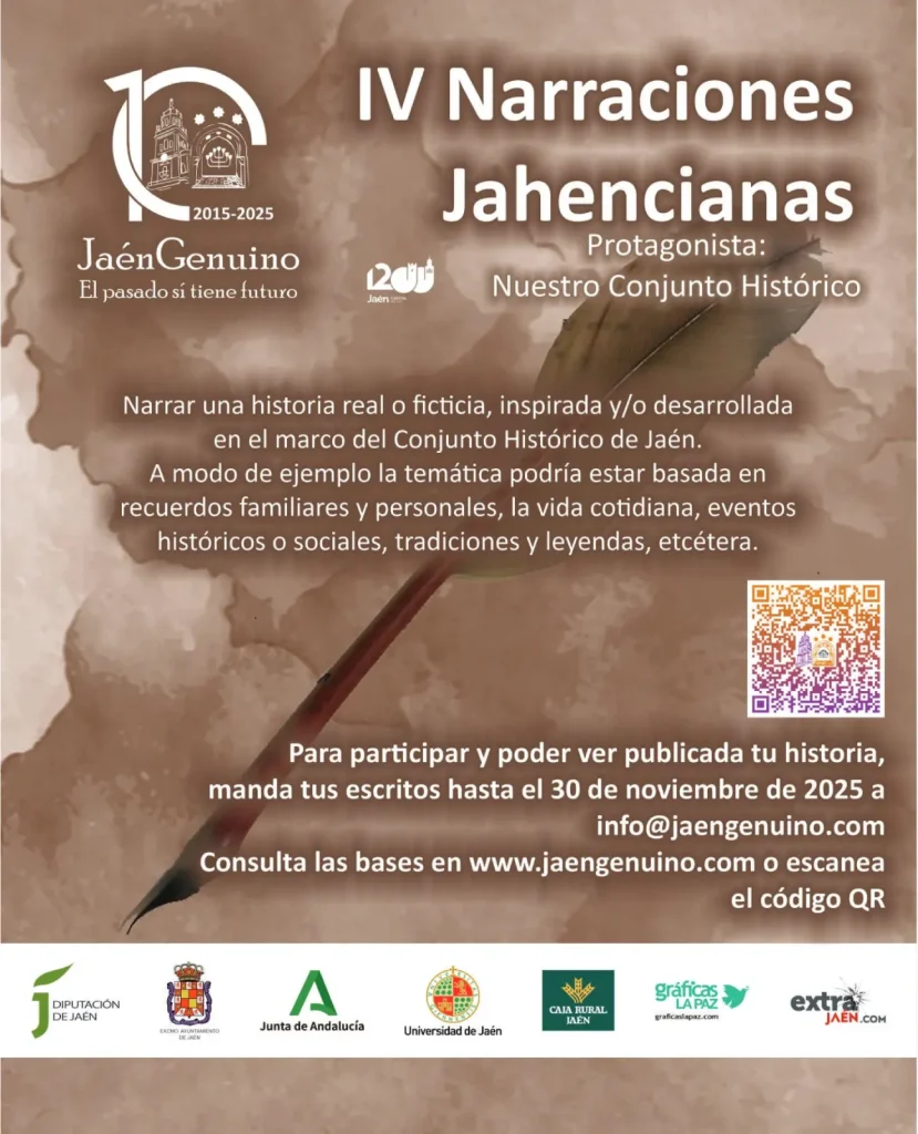 Manteniendo el espíritu y el fin de las dos ediciones anteriores, se convoca para el año 2025 las IV Narraciones Jahencianas, que también contarán con el premio de la publicación de un libro con las narraciones recibidas, ya sea con la totalidad o una selección de las mismas.